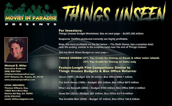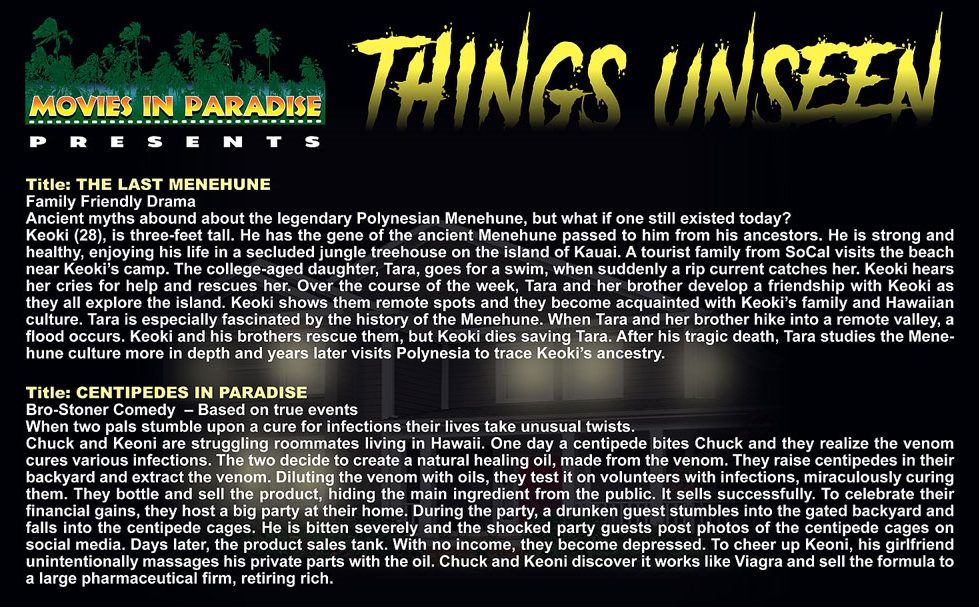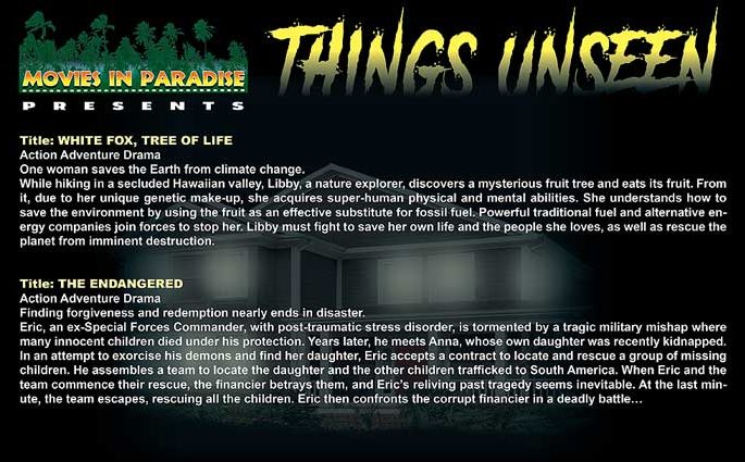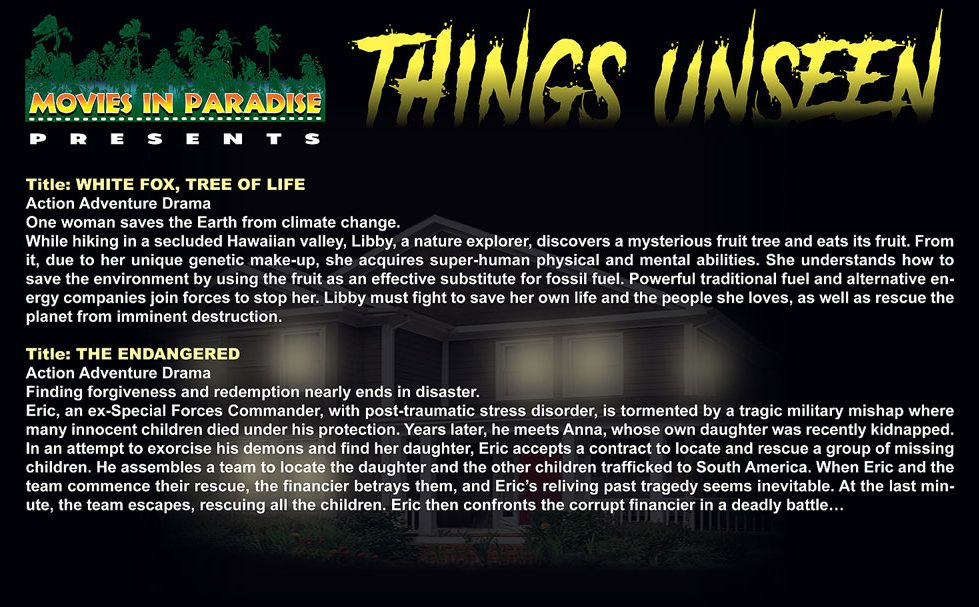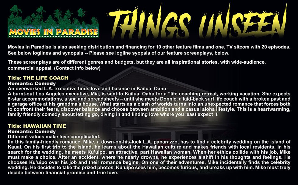 We believe that creative films should inspire and elevate viewers, offering alternatives to the content of many films these days. We do not create movies for merely entertainment sake. Moves in Paradise is a Hawaii-based Production Company. Our goal is to engage viewers in a positive fashion with films that have wide-audience, international appeal.